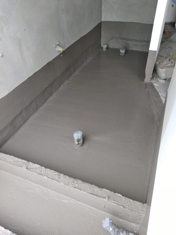 – Lăn lớp chống thấm thứ nhất lên bề mặt sàn và tường kết hợp dán lưới chống nứt góc chân tường, cổ ống rồi phủ kính lưới bằng hóa chất chống thấm. Định mức 1.0 kg/m2.